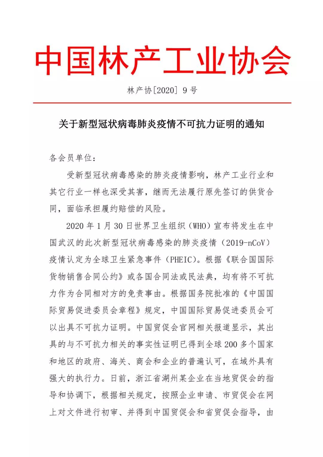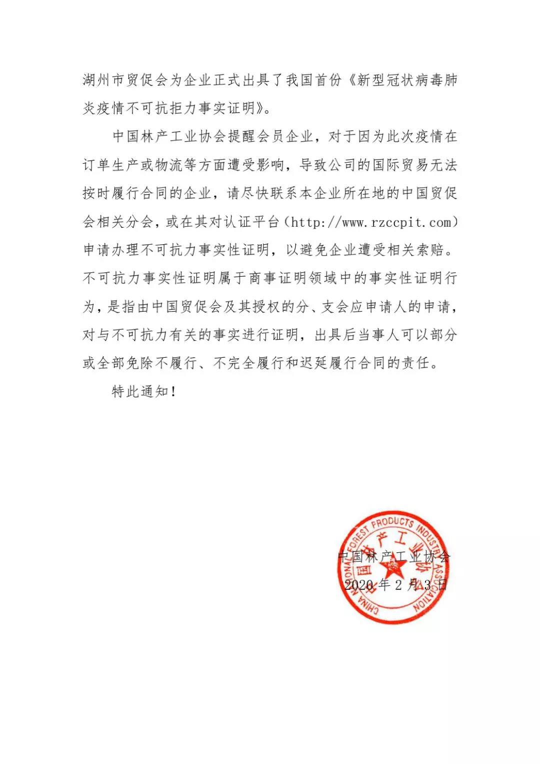 中國(guó)林產(chǎn)工業(yè)協(xié)會(huì)日前發(fā)布《關(guān)于新型冠狀病毒肺炎疫情不可抗力證明的通知》,提醒會(huì)員企業(yè)對(duì)于因此次疫情在訂單生產(chǎn)或物流等方面遭受影響,導(dǎo)致公司的國(guó)際貿(mào)易無(wú)法按時(shí)履行合同的企業(yè),盡快聯(lián)系本企業(yè)所在地的中國(guó)貿(mào)促會(huì)相關(guān)分會(huì),或在其認(rèn)證平臺(tái)(http://www.rzccpit.com)申請(qǐng)辦理不可抗力事實(shí)性證明,以避免企業(yè)遭受相關(guān)索賠。